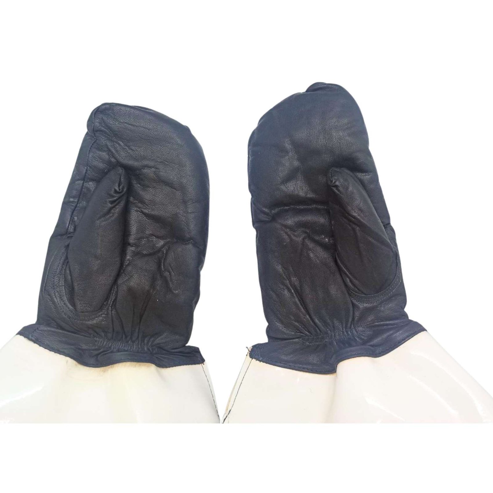 Authentic Soviet Militia (Policeman) motorcycle leather mittens, crafted from 100% genuine leather and issued to USSR motorized and traffic police units. Designed for extreme conditions, these heavy-duty mittens offered superior warmth and protection during long patrols on Soviet roads.
